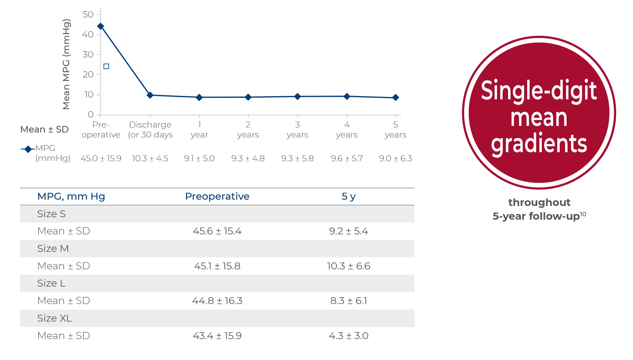 A força radial no anel de entrada e o design do stent superelástico permitem uma excelente hemodinâmica com resultados estáveis ao longo do tempo. 4,10