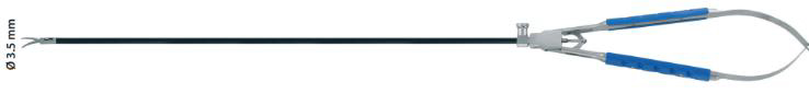 Tesoura para dissecção e corte de tecidos moles. Curva, longa e fina (≈ 3,5 mm)
